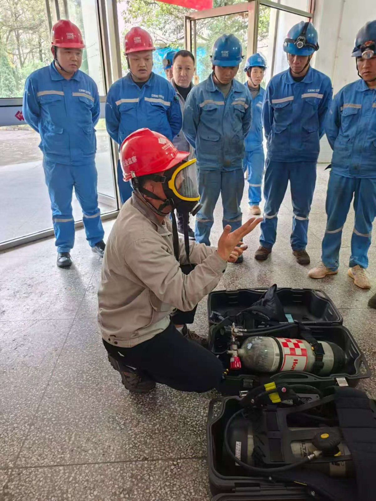 在正压式空气呼吸器培训环节,讲师聚焦实操关键要点,重点演示了佩戴前的“三查”核心流程:一查气瓶压力是否达标,确保供气充足;二查面罩密封性是否完好,杜绝漏气隐患;三查报警哨是否在5-6MPa时准时鸣响,保障预警有效。通过现场模拟作业场景演示,参训人员逐一掌握了快速穿戴、供气阀连接、面罩密合调整等关键操作,明确了应急状态下的操作规范与注意事项。